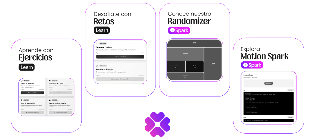 Artiva Spark es un espacio para explorar, crear y poner en práctica tus ideas. Aquí encontrarás retos, cuestionarios y herramientas que te ayudarán a fortalecer tus habilidades en diseño, animación y UI. Desde conceptos clave hasta utilidades como UI Randomizer o Spark Motion, todo está pensado para que aprendas de forma dinámica y lleves tu creatividad un paso más allá.